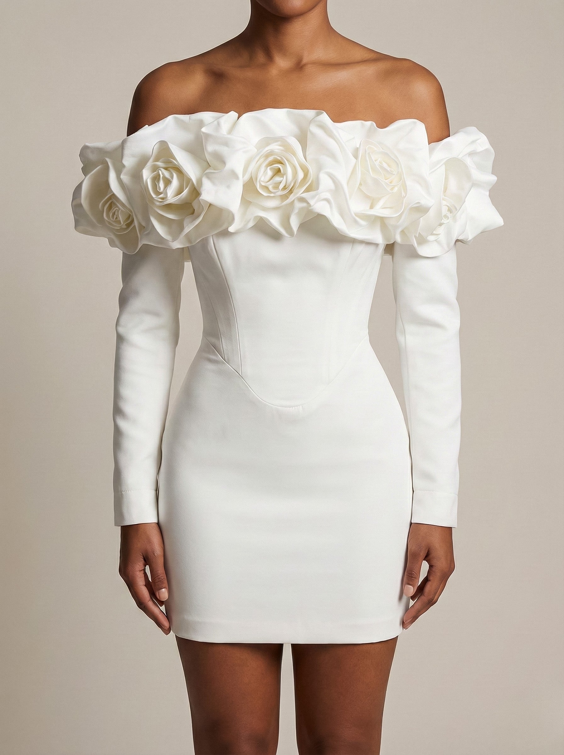 - Off shoulder, ruffles with hand made roses